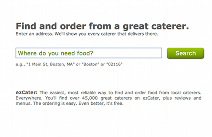 ezCater,a Boston-based company, announced Wednesday it had raised a $630K seed round. Investors listed are Jill Preotle, Director and early investor at ZipCar and TaskRabbit; Spinnaker Trust; Mike Masterson, co-founder and Director at Oak/Kleiner-backed Sundrop Fuels; Ed Belove, former VP of R&D at Lotus and at AT&T; and members of Walnut Venture Associates.The online catering middleman provides reviews, ratings, and menus to help connect customers to local caterers.
