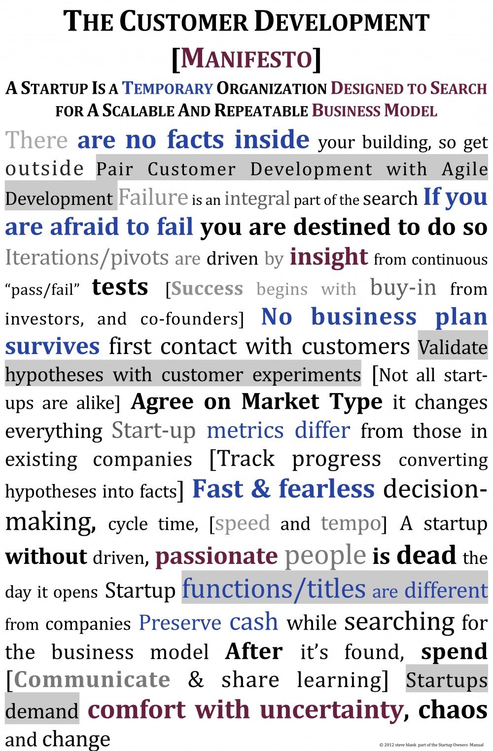 Quite a few people have asked for a way to remember these without having to dig through the book. So by popular demand, here’s a poster of the Customer Development Manifesto. You can order a copy here.