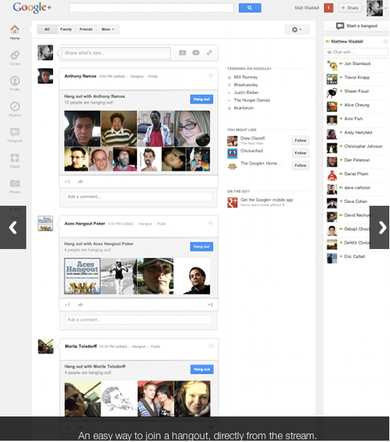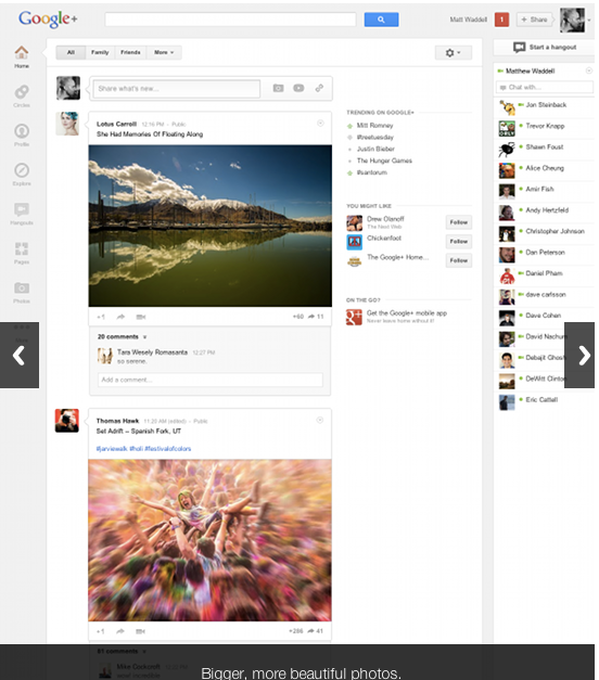 Some of these new features are defiantly exciting, and with more than 170 million people that have upgraded and created a Google+ account, there was a need for more customizing and exploration. It’s hard not to draw comparisons between some of these new options and what Facebook and Twitter have been doing for a while now. The photo-centric focus clearly has Facebook Timeline written all over it, and the explore feature is quite a Twitter inspiration.