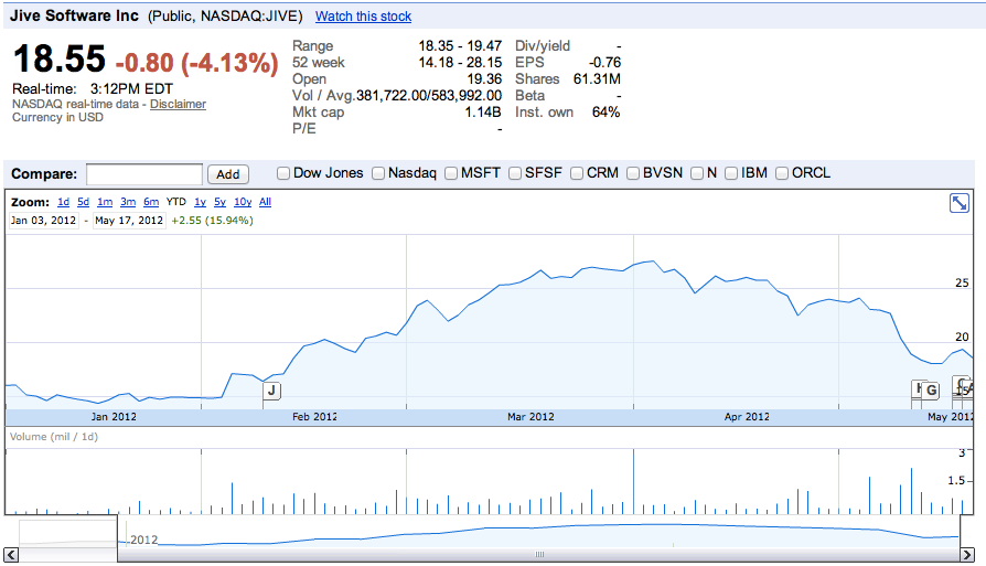 Volume in early trading was 13.4 million shares (significantly more than the expected 11.7 million). At the current price, Jive is trading at a market cap of $708 million.