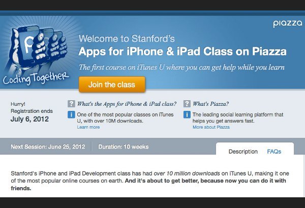 Stanford is gearing up to offer its wildly popular free online video course in iPhone and iPad app creation. But this time, the summer course that has drawn hundreds of thousands of aspiring app creators is getting a new social twist with the help of Piazza. The online forum for study help will allow the multitudes of students who sign up for the course get help from their peers.