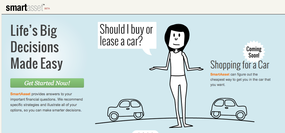 SmartAsset essentially is focused on helping people make decisions about their finances. For now, it’s focused on home-buying questions, such as, what mortgage can a person afford based on their income and down payment. But there are 23 other big financial decisions that SmartAsset would like to be able to provide answers for, such as whether to buy or lease a car, and how to pay for a child’s education, and how to save for retirement.