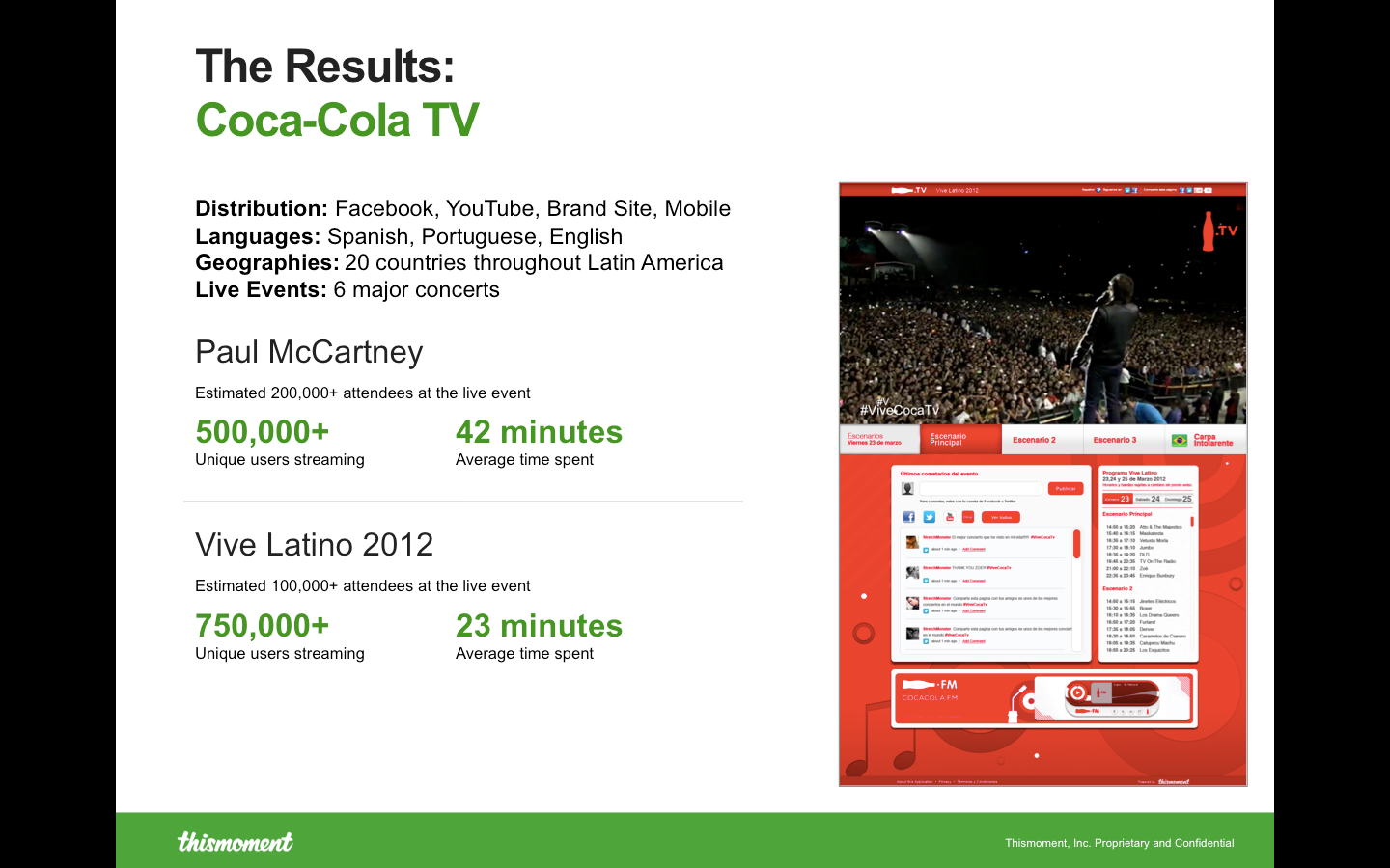 This kind of dynamic branding is helping brands stay in front of fans, said John Bara, chief marketing officer of Thismoment, in an interview. In fact, for the Paul McCartney concert, Coca Cola saw 500,000 streams from across the different touch points and an average of 42 minutes per session. This kind of engagement would probably not have occured had Coca Cola not had a comprehensive and cohesive experience and tailored experiences that Thismoment gave the audience, Bara said.