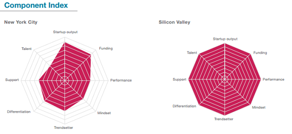 While Silicon Valley came in first in every category, New York was more of a mixed bag. While it came in high for activity and funding, it came in dead last when it came to talent. In every other category, it was either seventh, eight or ninth.