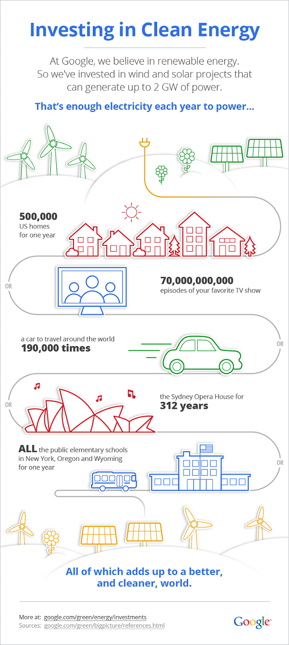According to an infographic, the projects that Google has invested can generate up to 2 gigawatts of power. That can power 500,000 homes, 70 million television shows, 190,000 car trips around the world, the Sydney Opera House for 312 years, and all of the public elementary schools in New York, Oregon and Wyoming combined for a full year.