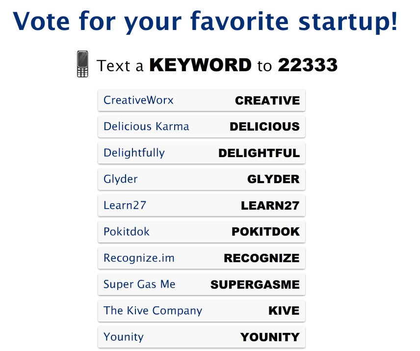 Now it’s time for the audience to choose the People’s Choice winner. To do so, text in your votes. Voting begins at 8:45, after the startups pitch on-stage.