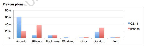 Where the two tend to differ is the device from which they upgraded. Fully 60% of GS III buyers previously owned an Android phone, while only 9% previously owned an iPhone. But among iPhone buyers, only 37% are coming from iPhone while 20% are coming from Android. Some 30% of iPhone buyers are coming from a standard phone, compared to 18% of GS III owners.