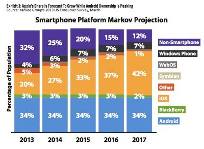 loyalty. Indeed, the Yankee Group estimates that by 2015 (two years!!), 42% of the population will consist of iPhone owners, compared to 34% will be Android phone owners.
