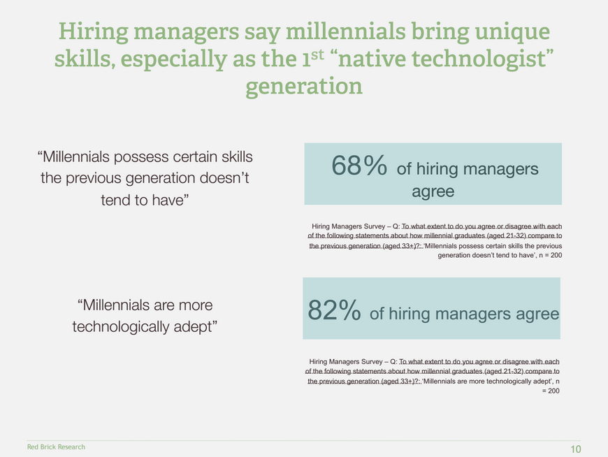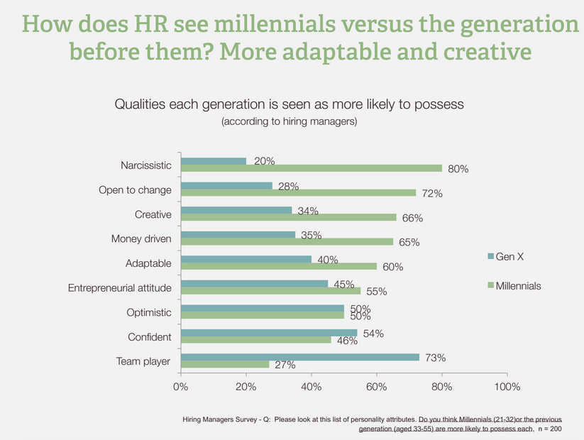 In the first screen shot, you’ll notice that hiring managers (those above 33 years old) actually saw their generation as being nearly as equipped to be entrepreneurs. Millennials were seen to have an “entrepreneurial” attitude by a 10% margin over Gen X. That means hiring managers don’t see anything particularly unique about millennials [over their generation] when it comes to having an entrepreneur attitdue – being self-driven, self-directed risk-takers with self-initiative.