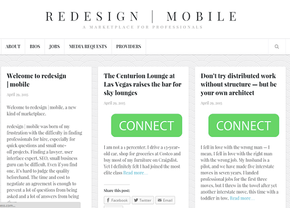 Redesign Mobile wants to make it easier to connect with professionals, by checking their academic credentials and professional certifications. Users can read expert analysis by the professionals before they pay, which can be done with a credit card online.