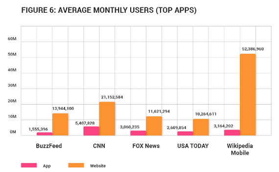 According to the report, “mobile users who access news through apps spend more time reading the content, but the overall audience for apps is small.”