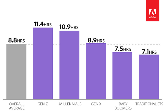 Unsurprisingly, the survey found that the amount of time spent on screens goes down with each successive generation; while consumers spend, on average, 8.8 hours a day engaging with digital content, that number is higher with younger generations and lower with older generations. Gen Z, for example, spend 11.4 hours a day on their screen, while Millennials spend 10.9 hours, but Baby Boomers spend 7.5 hours.